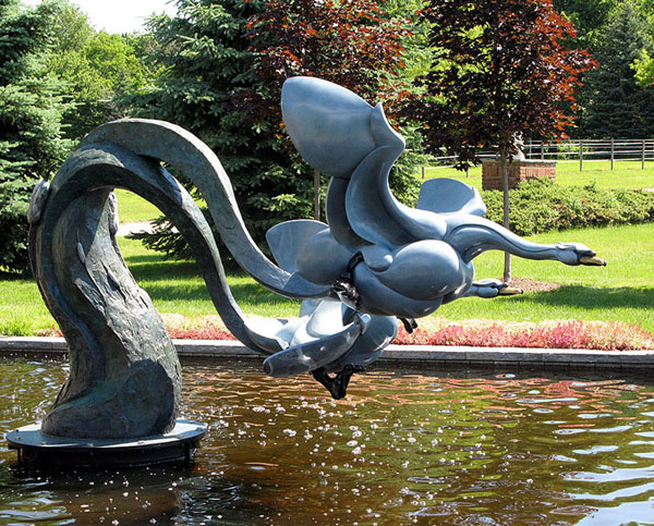 Visitors can almost feel the wind beneath the wings of this Trumpeter Swan couple as they jockey in for landing onto this 150ft long reflection pond. Surrounding by a curved cascading water wall and three waterfalls leading into the pool, this is an oasis unlike any other. Water Jockeys is a sculpture placement of immense beauty at Tapper Gardens in Romeo, MI.